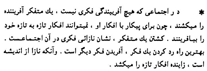 – ملتی، فرهنگیست که فلسفهی خودش را میآفریند و ملتی بیفرهنگست که فلسفههای دیگران را که برای زندگی خودشان آفریده اند، قرض میکند، تا زندگیش را هم قرضی بکند. ولی زندگی خود را نمیتوان از دیگران، قرض کرد.